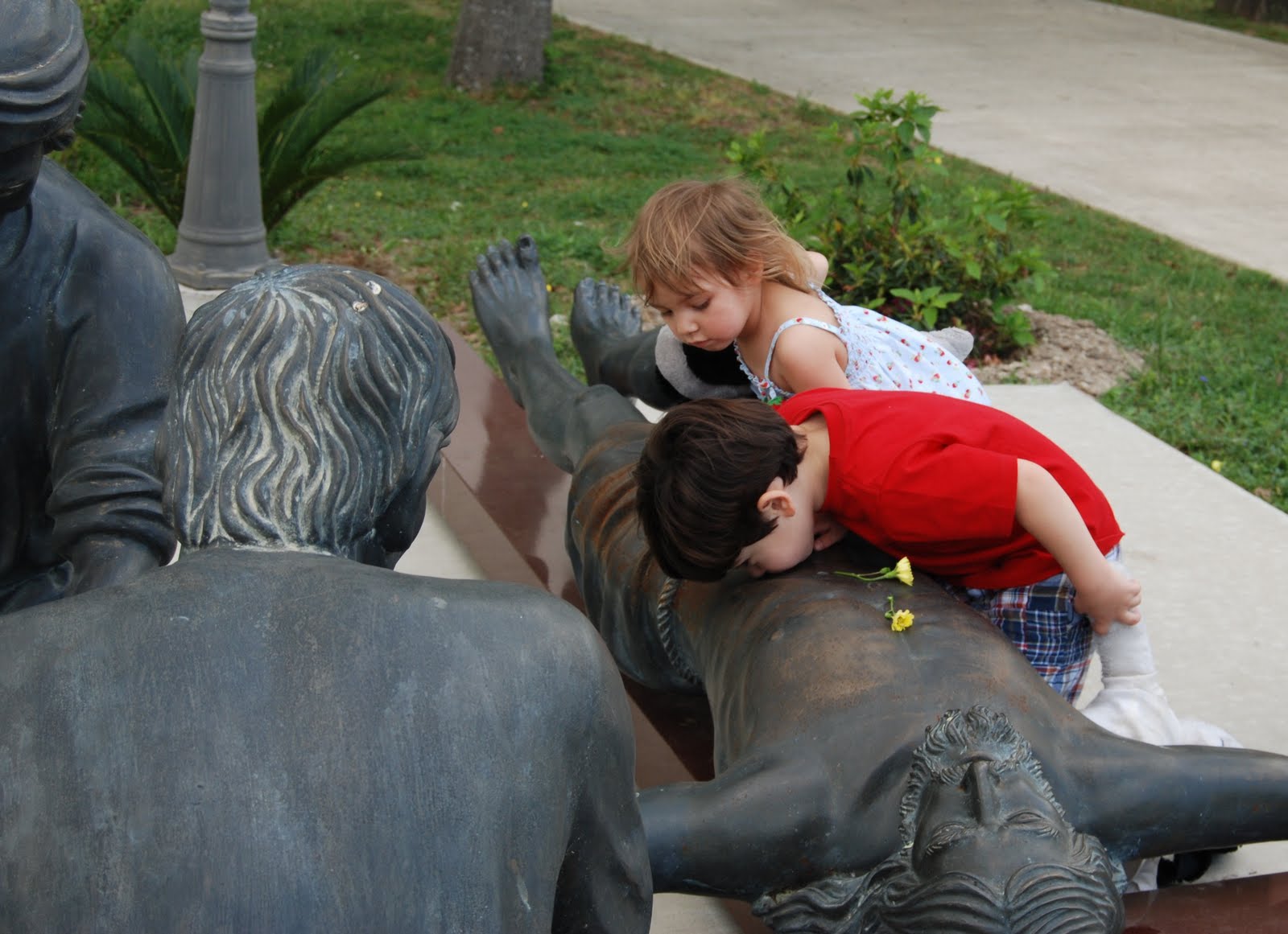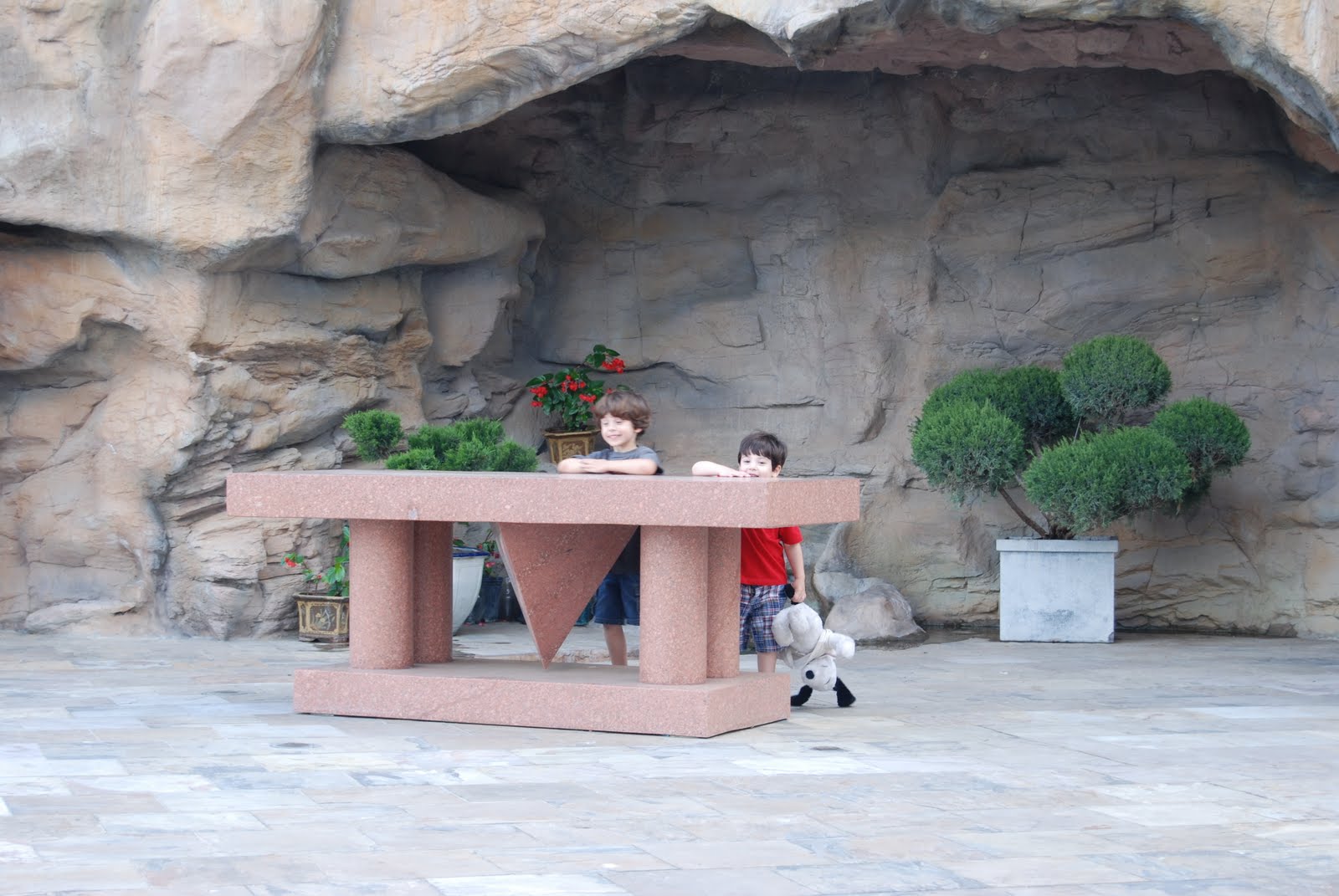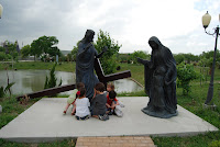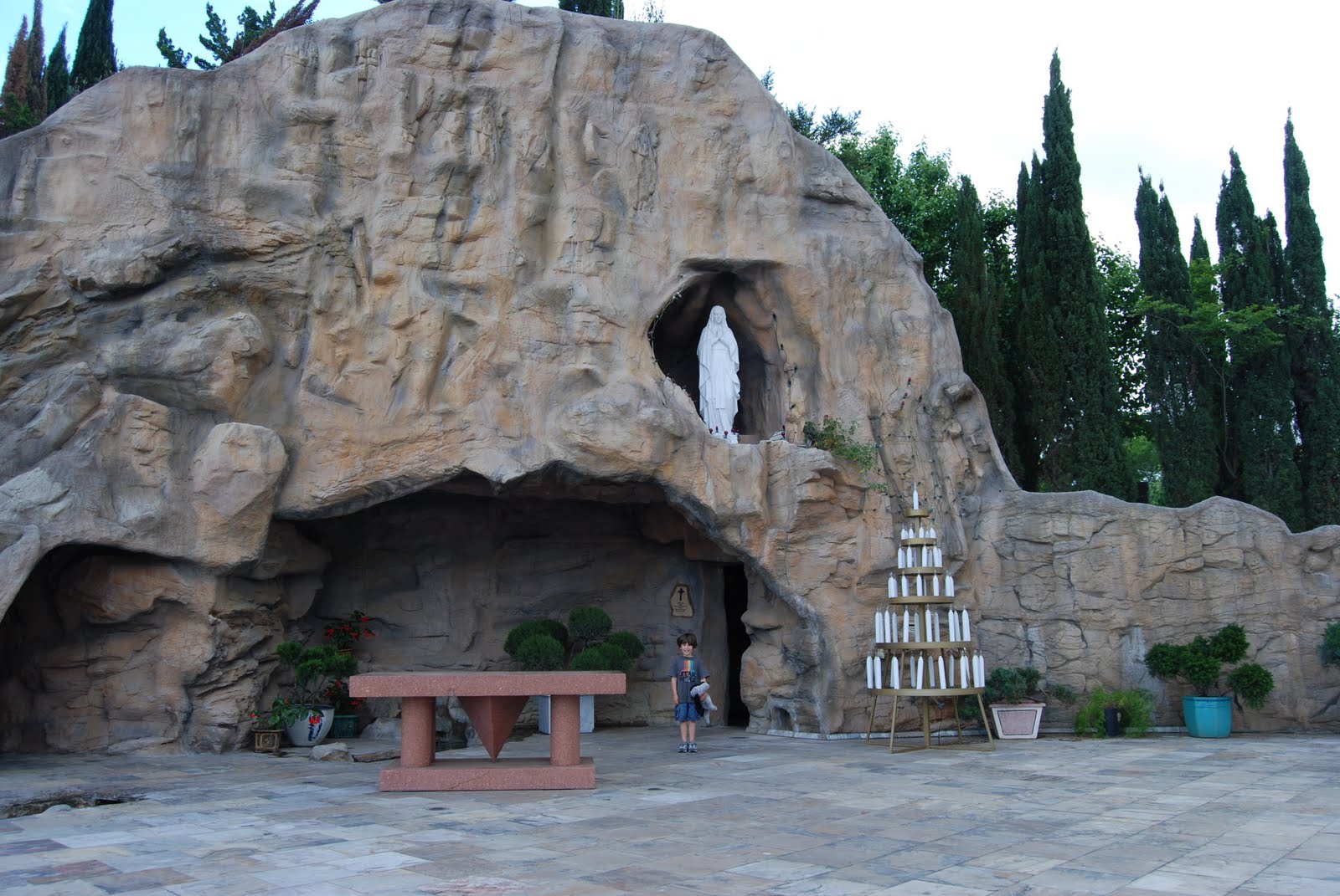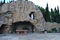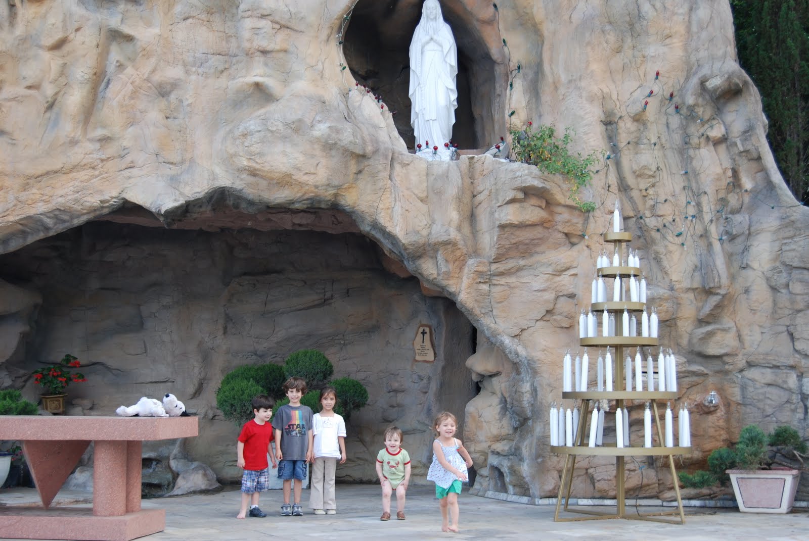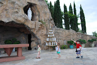 In honor of St. Bernadette’s feast day, Friday afternoon a friend and I took our children to the Grotto at Our Lady of Lourdes parish off of 290. Oh My Gosh! This place was awesome! I’d seen a few pictures, and honestly, was a bit worried the place would be cheesy. I couldn’t have been more thrilled with it, and the children loved it. The boys were a bit spastic that afternoon, but considering Goose had been in school all day and the others were in a car for most of the day, I guess their behavior was normal. The Grotto itself was stunning and had a small chapel inside. Of course, all the kids had to light a candle. It was almost like bedtime, the amount of people the kids were praying for just so they could light another candle. There is also an outdoor Stations of the Cross. Wish I’d known about this before now. Regardless, at each station the boys (or girls) correctly identified the Station and said a prayer. It was pretty sweet. And worth driving home in rush hour traffic. They are building what seems to be a beautiful new church there. I am already making plans to return soon! (And I know Kobra looks awful in his outfit. I guess it’s time to change out “extra” clothes in the diaper bag.)